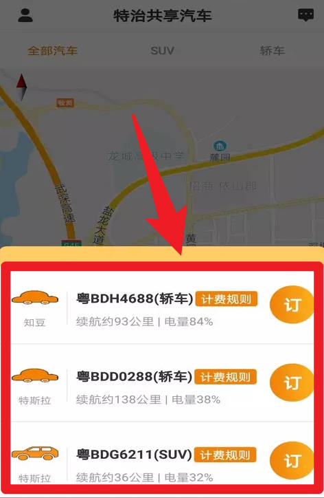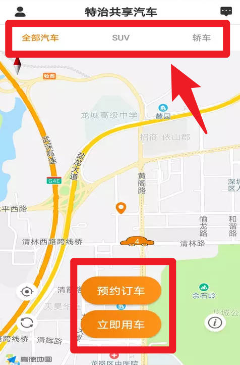 3、地图页面可选择全部汽车、SUV或轿车分类,并能快速预约订车或立即用车,操作简洁。