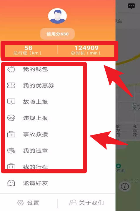 5、个人中心展示总行程、总时长及信用分,并提供钱包、优惠券、事故救援、行程记录等功能。