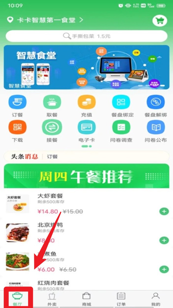 3. 登录成功后系统默认进入“餐厅”模块,在这里可以查看菜品、选择套餐并直接下单点餐,支持取餐与支付功能。