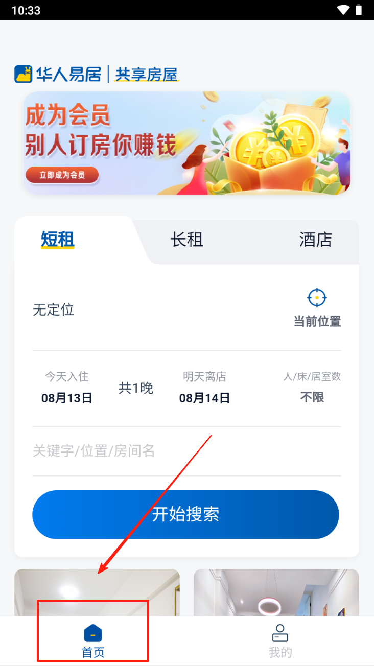 1、在首页点击“开始搜索”按钮,进入房屋搜索页面。设置入住和离店日期,选择房间数量。