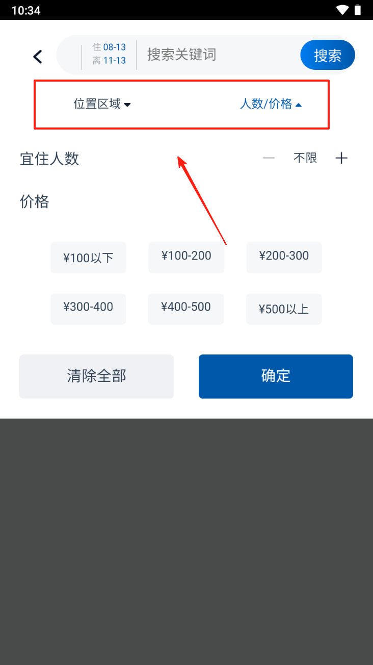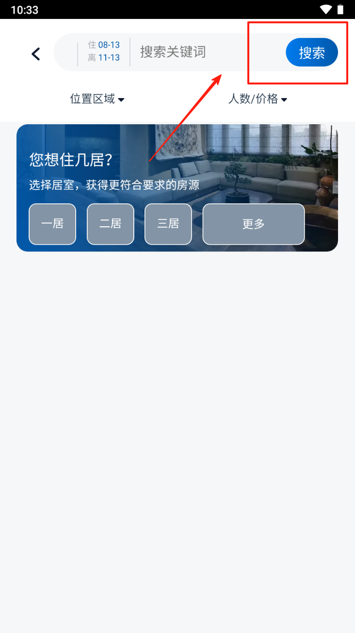 2、在搜索页面,输入关键词并点击“搜索”按钮。筛选位置、人数和价格等条件。