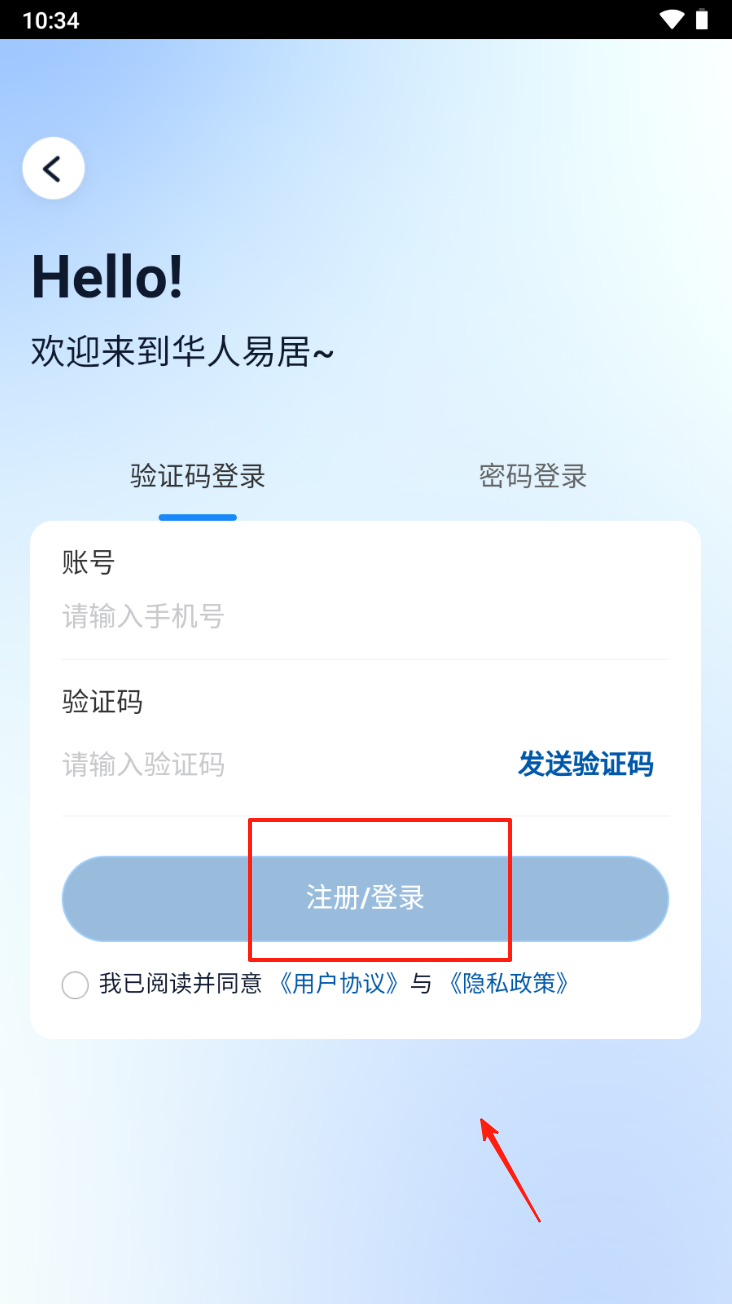 4、在登录页面,输入手机号和验证码,点击“注册/登录”按钮。