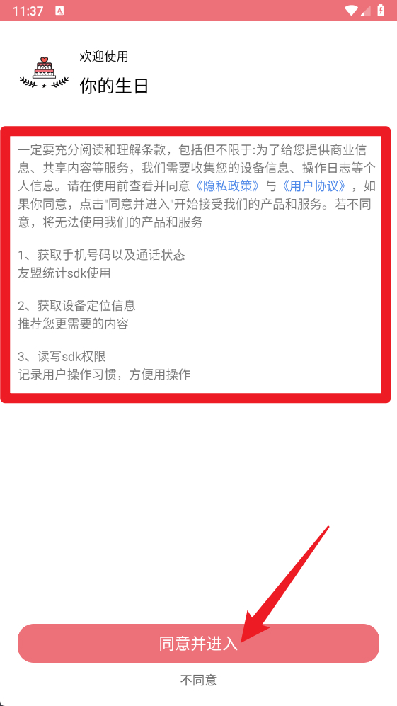 1、首次打开【你的生日】,需同意隐私政策,点击【同意并进入】后即可开始使用。