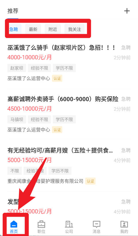 3、职位推荐板块提供急聘、最新、附近和关注四种筛选模式,帮助用户快速浏览合适岗位。