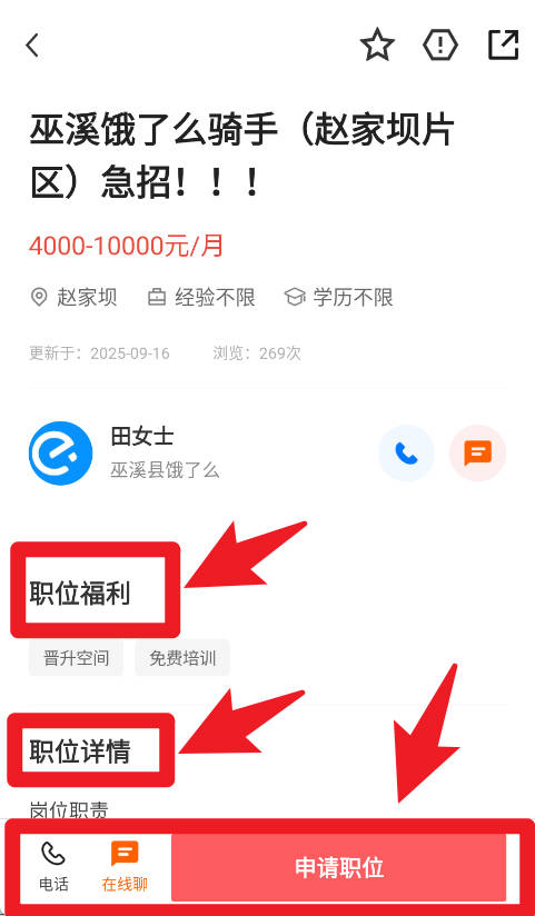 4、职位详情页面展示职位福利、职位详情和申请入口,用户可直接在线沟通或申请岗位。