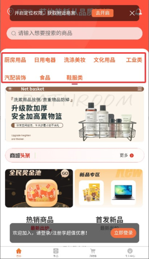 2、在首页导航栏选择"商品分类"选项,浏览各类精选商品和促销活动信息。