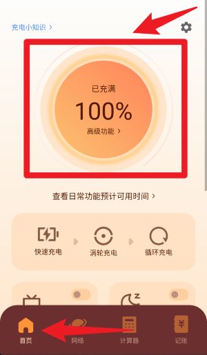 1、在首页中可查看当前充电进度与百分比状态,点击中心按钮可进入高级功能页面。