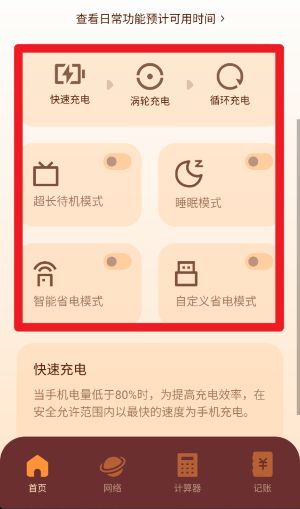2、下滑页面可切换多种充电模式,包括快速充电、涡轮充电与循环充电,还能一键启用超长待机、省电模式等多项节能功能。
