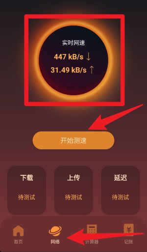 3、点击底部导航栏“网络”图标,进入实时测速页面,点击“开始测速”即可查看当前的网络上传与下载速度。
