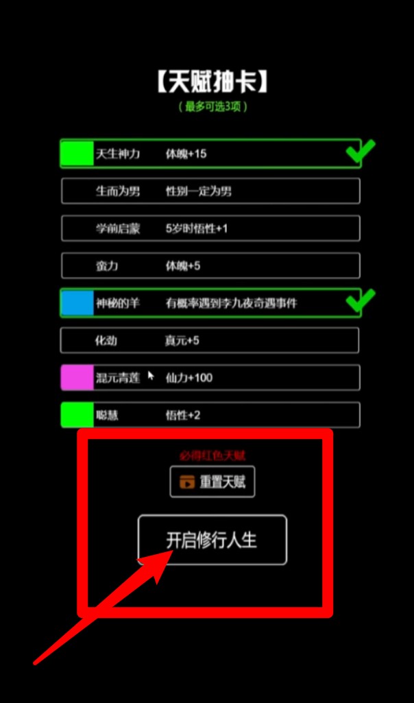 2.天赋抽卡:进入游戏前可抽取并选择最多三项天赋,不同组合将影响修仙之路的发展与机缘,增加策略性。