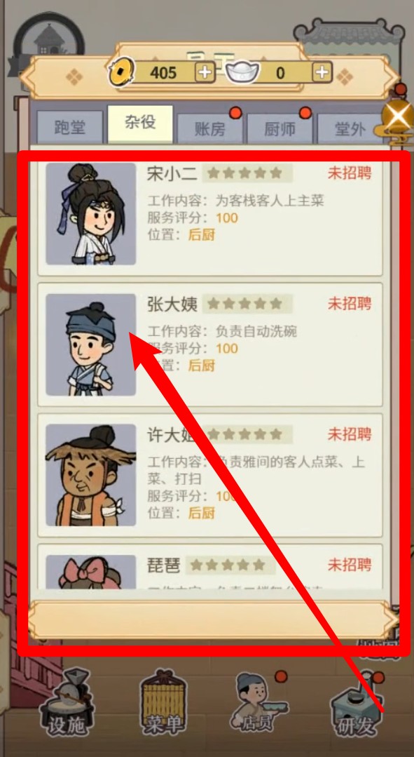 1.招募员工:玩家可在员工界面招募不同角色,如宋小二负责上菜,张大婶自动洗碗,合理安排分工提升客栈效率。