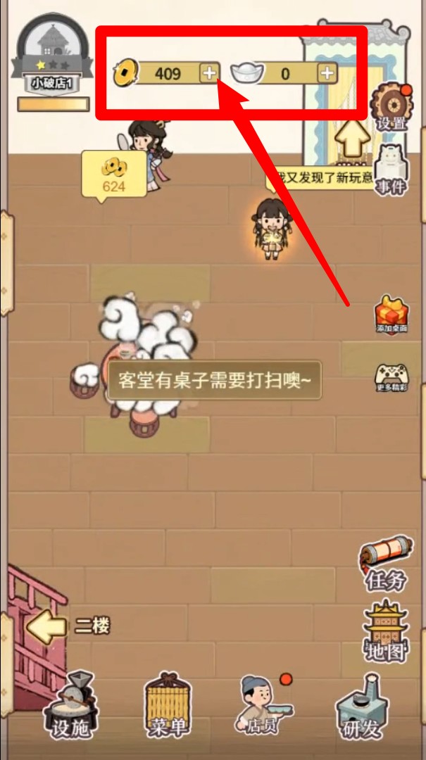 2.资源显示:界面上方清晰显示金币与银两数量,金币用于日常经营与扩建,银两则在后续发展中解锁更多高级功能。