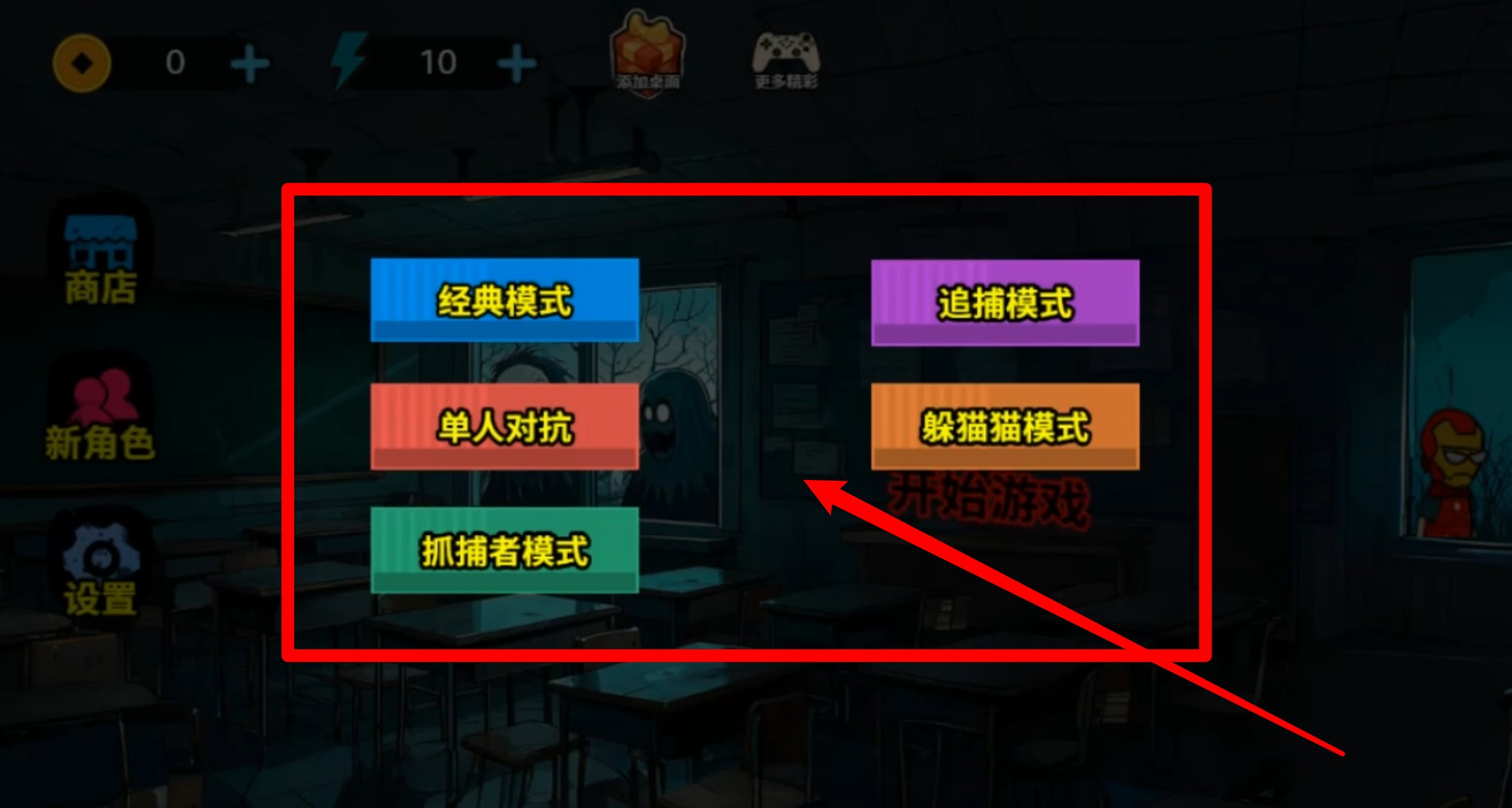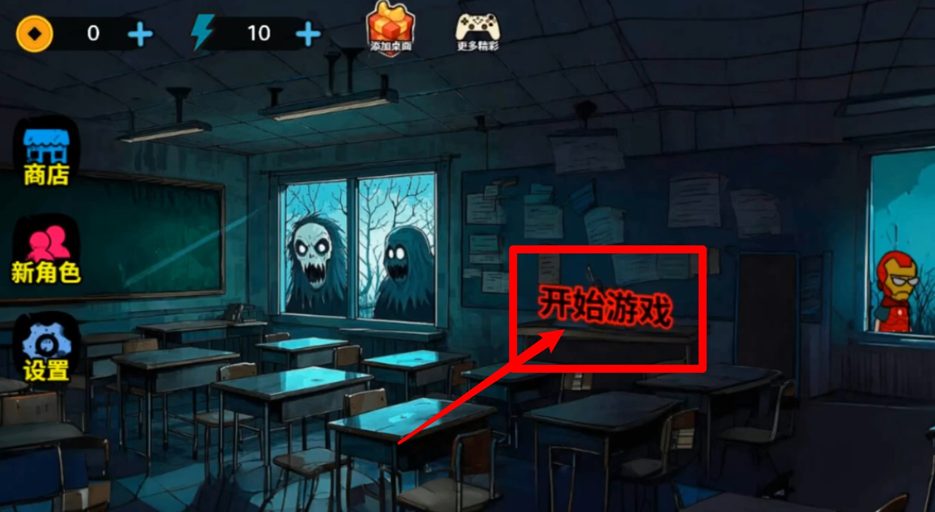 1.开始游戏:主界面点击开始游戏按钮即可进入关卡,搭配阴森教室氛围与窗外怪物背景,增强代入感与紧张感。