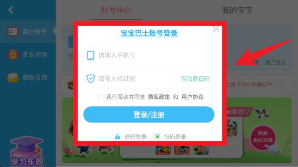 1、首次进入应用时需要注册或登录宝宝巴士账户,输入手机号与验证码后点击“登录/注册”即可完成验证。