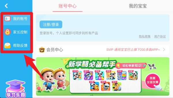 5、点击家长中心,可以进入“我的账号”“家长控制”与“帮助反馈”页面,方便进行账号管理与功能设置。