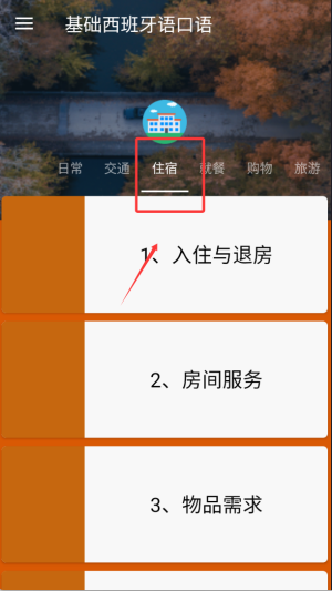 4、西班牙语住宿口语部分涉及酒店预订、客房服务及退房流程等场景的专业用语教学,帮助使用者掌握住宿交流技能。
