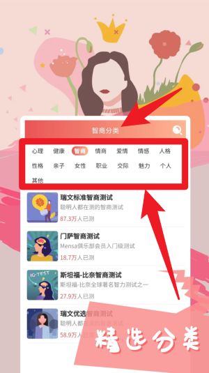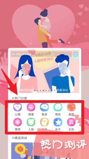 1、在首页的热门分类中,用户可以根据需求选择心理、健康、智商、情商、爱情、亲子等不同类型的测试,快速找到适合自己的测评内容。