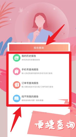 4、完成测试后,用户可通过“报告查询”功能查看结果,支持历史报告、手机号、订单号等多种方式查找,确保随时查看评估内容。