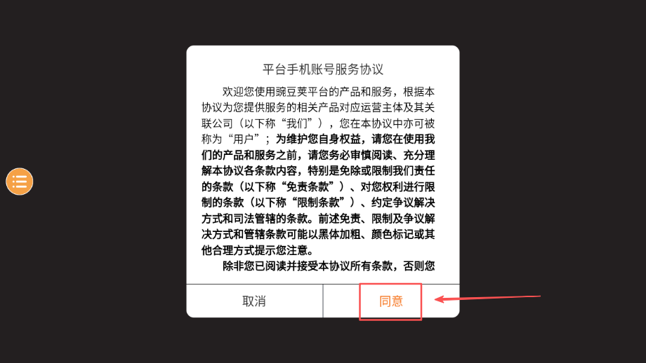 1、打开游戏后会看到游戏协议,得点一下同意,要是不同意的话,就没法继续使用游戏里的各种功能,这一步可不能跳过哦。