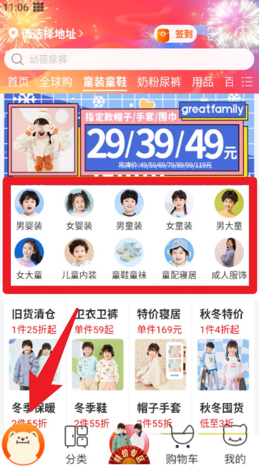 1. 进入 App 后点击左下角熊脸图标,即可回到首页页面,在顶部可浏览童装分类与搜索功能入口。