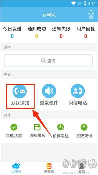 1、下载并打开云喇叭快递取件通知APP,来到主界面,找到“发送通知”选项并选择。
