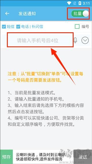 2、在输入框填写取件人手机号码,如果有大量号码请勾选“批量”,点击输入框边的语音键,进行语音输入。