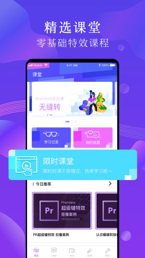 1、进入“课堂”页面,可查看“今日推荐”与“好课榜单”,点击进入即可学习精选课程,涵盖PR特效与视频剪辑实战案例。
