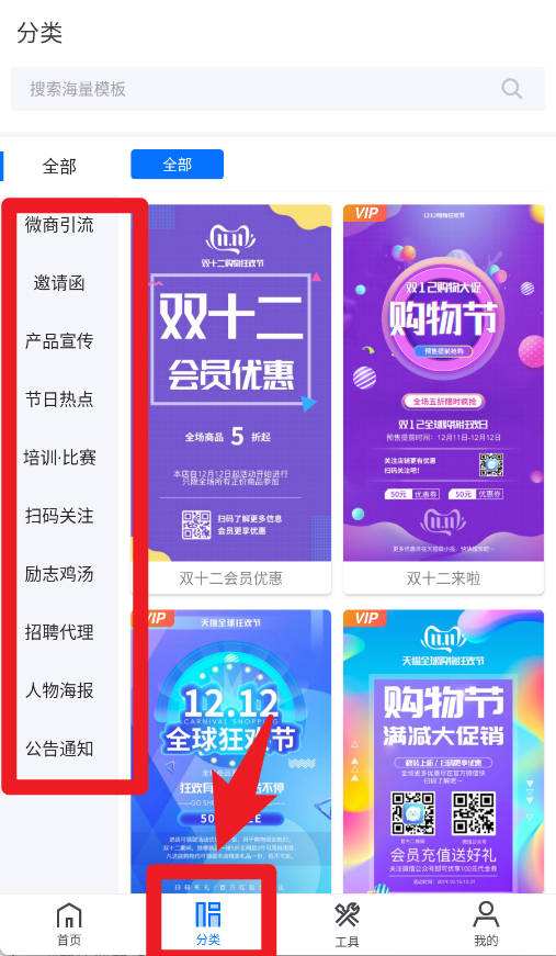 4、分类页面提供微商引流、邀请函、节日热点、招聘代理等丰富模板,方便用户快速定位所需。