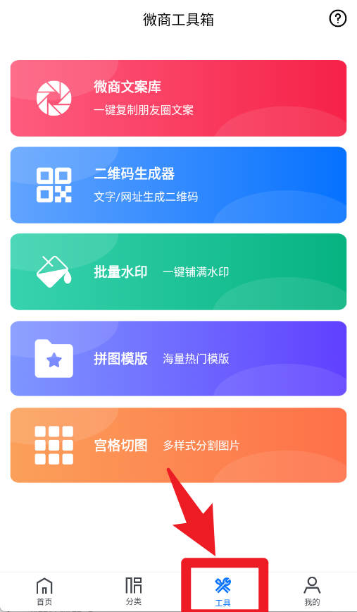 5、工具箱内含微商文案库、二维码生成器、拼图模板等实用功能,助力高效完成创意设计。
