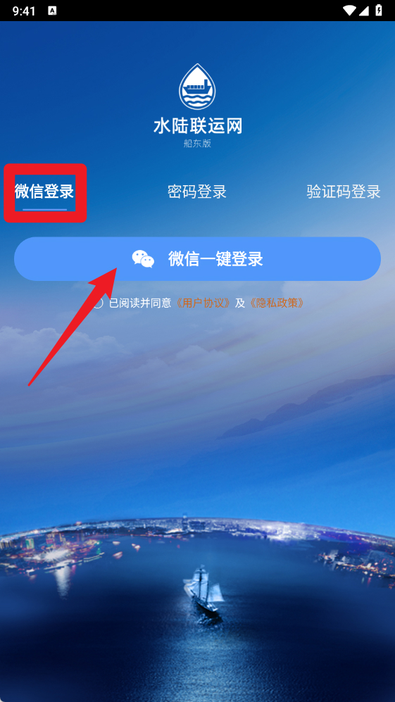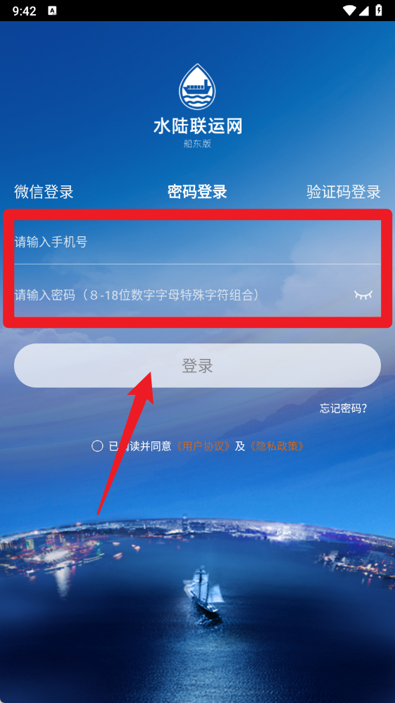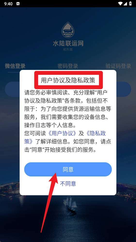1、首次打开水陆联运网(船东版)会弹出“用户协议及隐私政策”提示,请仔细阅读条款后点击下方蓝色“同意”,同意后方可继续进入登录界面。