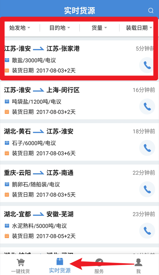 4、进入底部“实时货源”栏目,可按始发地、目的地、货量、装载日期等条件查看最新货源列表,支持快速联系发布方把握装运时机。
