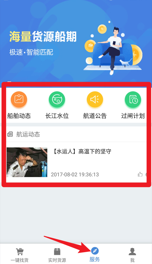 5、切换底部“服务”页面,查看船舶动态、长江水位、航道公告与过闸计划等工具,并浏览航运资讯内容,获取运营所需的实时信息。