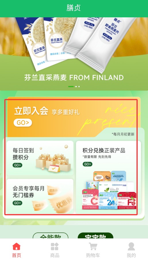 2、在首页功能区,可点击立即入会、每日签到或使用积分兑换正装产品。