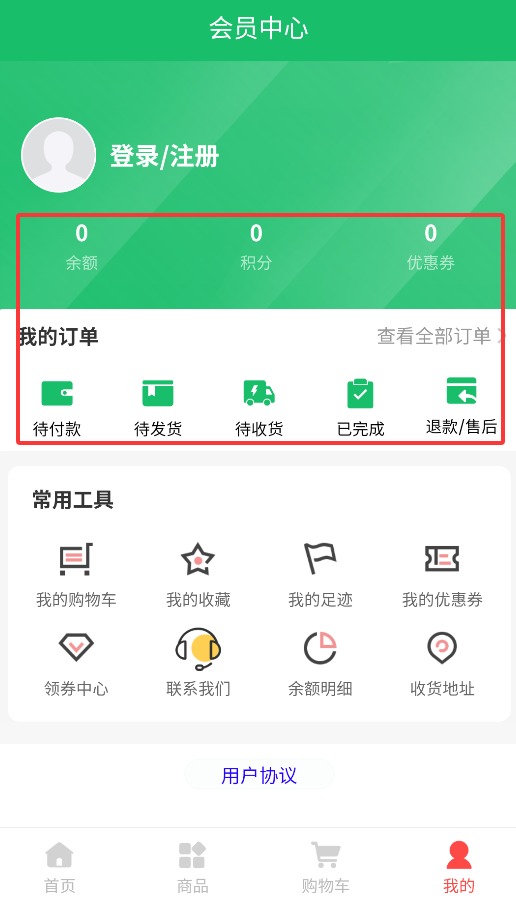4、进入个人中心后,可查看余额、积分、优惠券及订单状态(待付款/待发货/待收货/已完成)。