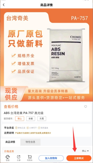 2、浏览商品时可查看详细技术参数和市场行情,通过对比功能筛选最合适材料,设置到货提醒和价格预警。