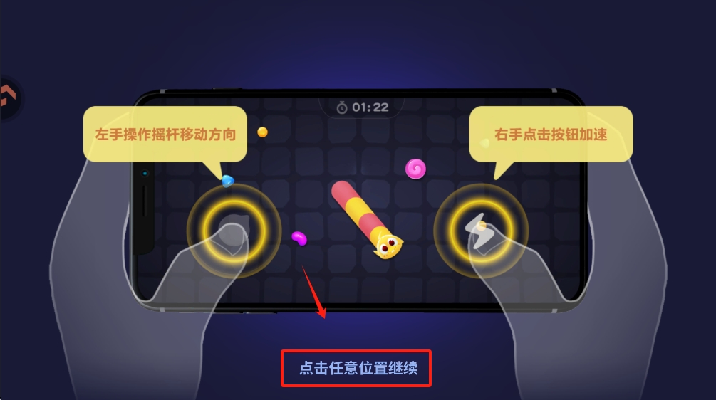 1、点击屏幕任意位置可继续游戏,保持蛇的连续移动,挑战更高分数。