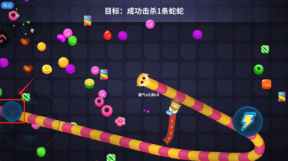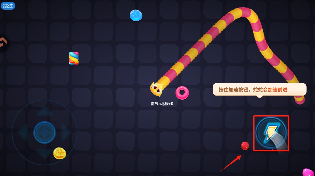 3、右手点击加速按钮,使蛇快速前进,以便更快地吃到更多食物。