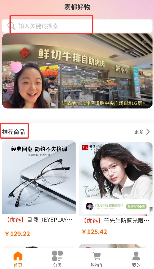 2、在首页搜索栏输入关键词查找商品,或浏览推荐板块查看精选内容。