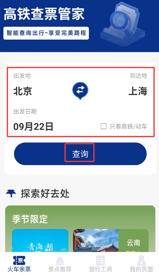 2、在火车余票查询板块,输入出发地、目的地及日期,勾选“高铁/动车”即可筛选查询。