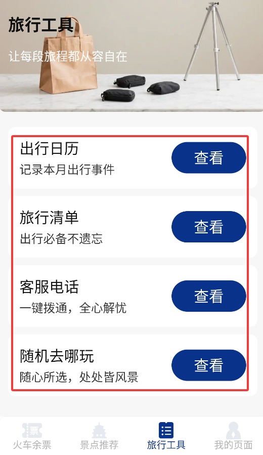 4、进入旅行工具中心后,可使用出行日历、清单管理、客服咨询及随机目的地推荐。