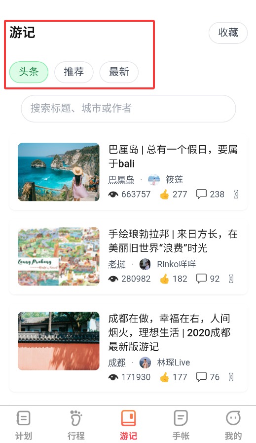 4、进入游记中心后,可浏览头条、推荐及最新旅游攻略,支持关键词搜索相关内容。