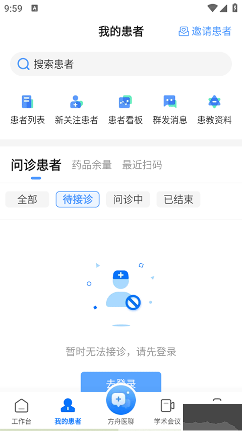 1、打开健客医院,先注册/登录账号,在工作台页面点击邀请患者,患者通过扫描医生出示的二维码可加入到医生旗下。