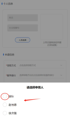2、点击社保卡申领或补换选项,根据提示选择本人办理或代办人操作。