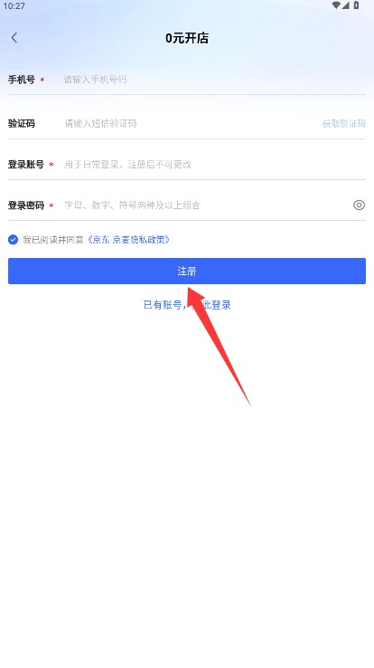 3、输入手机号和验证码,设置登录账号和密码,完成资料填写后点击注册。