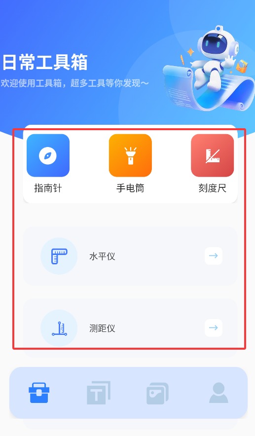 2、首页提供指南针、刻度尺、水平仪及测距仪等常用测量工具入口。