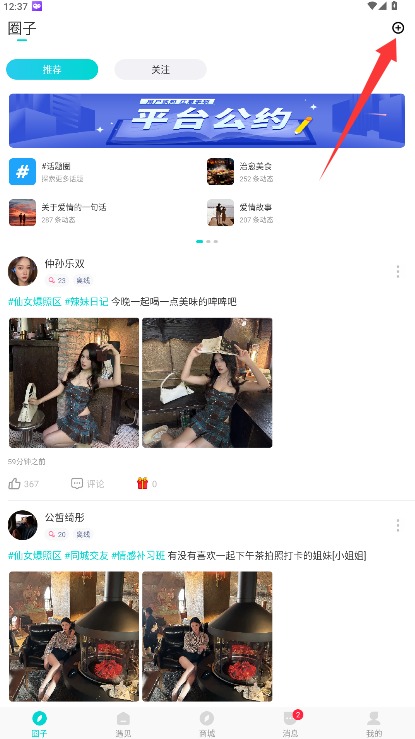 3、进入社区圈子主界面后,点击右上角的+号按钮进入动态内容编辑页面。