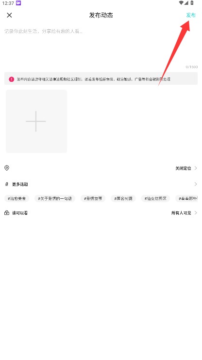 4、输入文字内容并添加相关图片素材,选择合适话题标签后点击发布按钮。