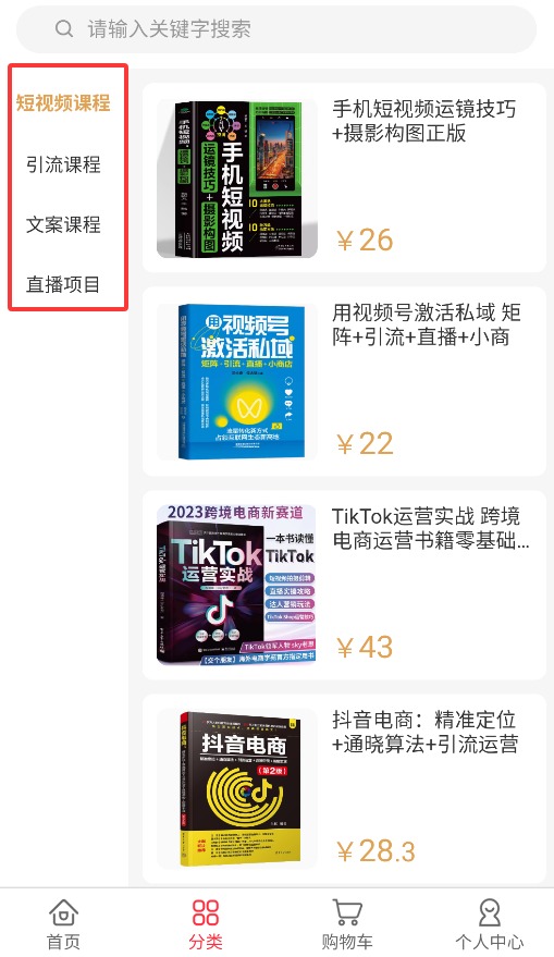 3、分类板块支持按短视频制作、引流技巧、文案创作等主题筛选课程。