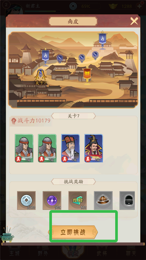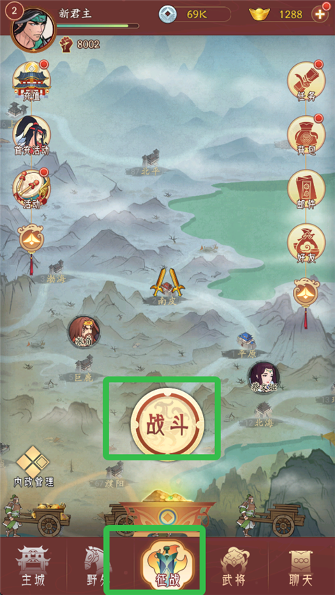 1、初次进入游戏时,点击主界面中的"征战"按钮即可开启你的首次战役挑战。