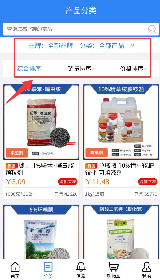 3、通过分类页面可按品牌、品类筛选商品,并支持排序方式查看全部产品。